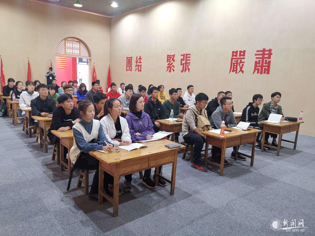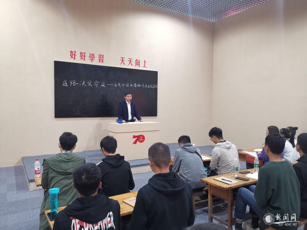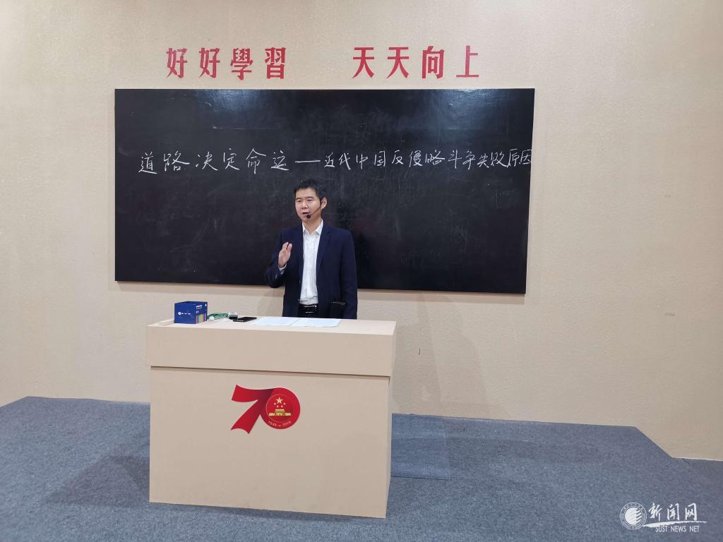 大粉笔、油漆的黑板、普通的小木桌、长条凳,10月10日下午,在陕西省庆祝中华人民共和国成立70周年成就展上,来自金沙官网马克思主义学院的武端利副教授为40名大学生和部分参观群众上了一堂以《道路决定命运——近代中国反侵略斗争失败的原因》的现场思政课。