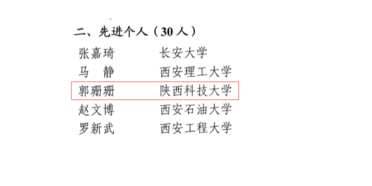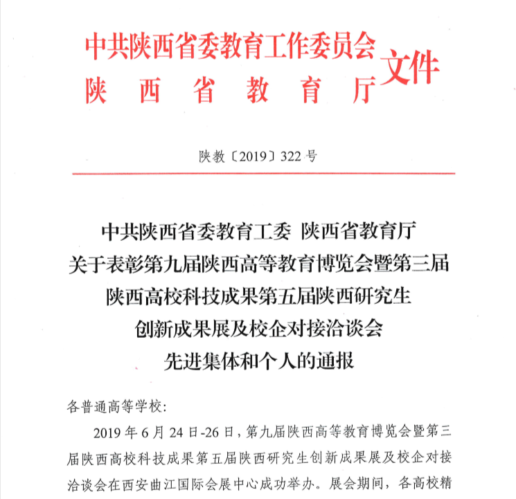 省委教育工委、省教育厅近日发布《关于表彰第九届陕西高等教育博览会暨第三届陕西高校科技成果第五届陕西研究生创新成果展及校企对接洽谈会先进集体和个人的通报》陕教〔2019〕322号文件,表彰全省高校在参展工作中表现突出的单位及个人,金沙官网宣传部郭姗姗同志获“先进个人”称号。