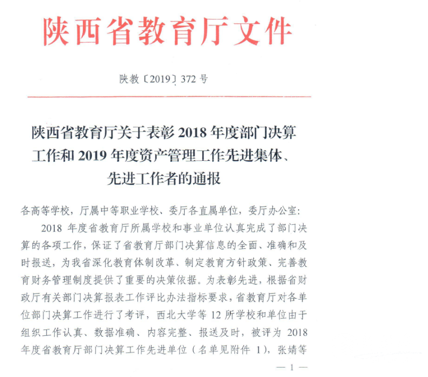 12月23日,陕西省教育厅下发《关于表彰2018年度部门决算工作和2019年度资产管理工作先进集体、先进工作者的通报》(陕教[2019]372号)文件,金沙官网荣获2019年度教育行政事业单位国有资产管理先进集体。这是金沙官网连续6年获此荣誉。