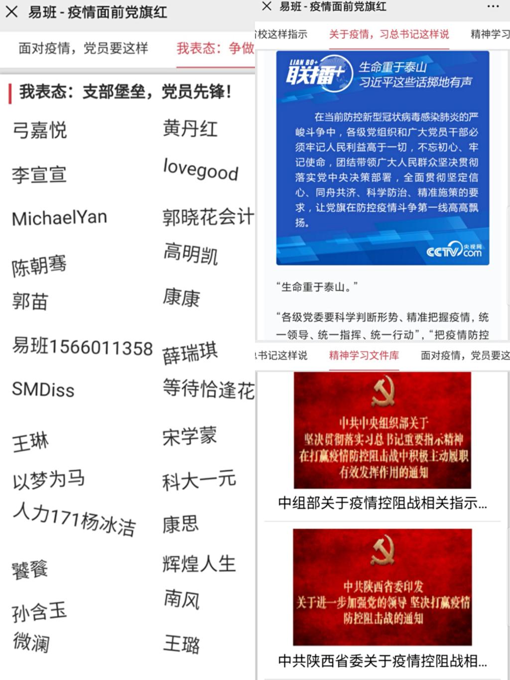 三是创新形式,做好引领。主动开展“疫情面前党旗红”特殊党日活动,通过易班搭建轻应用快搭,为经管学院全体党员、积极分子提供党中央抗击疫情相关指示、习近平总书记讲话等内容,引导党员配合各级各部门防疫工作,充分发挥一个支部一个堡垒的战斗作用,倡议全体党员勇面疫情,争做先锋。
