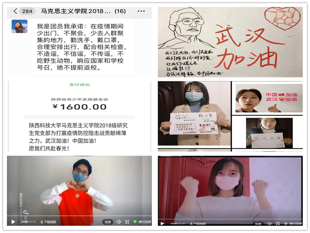 学院各党支部和广大党员充分发挥战斗堡垒作用和先锋模范作用,在战“疫”防控中践行初心使命,影响和带动周围群众坚定打赢疫情防控阻击战的信心和决心,充分展现了马院师生的责任和担当。多名教工党员报名参加“共产党员先锋岗”,支援学校疫情防控工作;教师党员秦玉东主动承担4位校外居住教师8天的值班任务;各学生党支部、团支部积极组织开展“疫情防控”线上主题学习讨论、为武汉捐款、“疫情防控,从我做起”线上承诺、录制“为武汉加油,为中国加油”视频和手指舞短片等活动,教育引导学生党员和团员青年争做真理的捍卫者、科学的传播者和谣言的粉碎者。