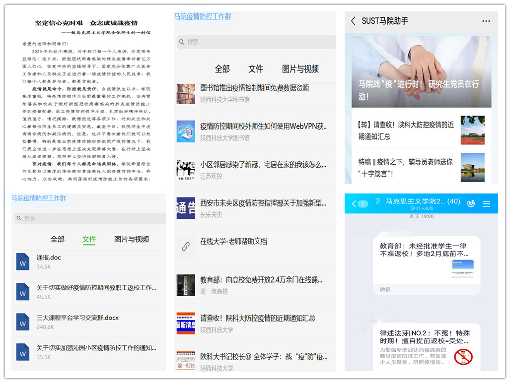 学院坚持“三个到位”工作标准,即学校要求通知到位、防控知识科普到位、思想认识统一到位,抓好疫情防控宣传教育。通过微信、QQ等方式及时传达学校关于疫情防控工作的各项安排和要求,发布或转发《坚定信心克时艰,众志成城战疫情——致马克思主义学院全体师生的一封信》《请查收!陕科大防控疫情的近期通知汇总》等通知公告,分享来自权威机构和官方媒体发布的预防知识,教育引导师生理性对待疫情、遵守学校规定、做好科学防护,切实把思想和行动统一到习近平总书记对疫情防控工作的重要讲话和指示批示精神上来,统一到学校关于疫情防控的决策部署上来。