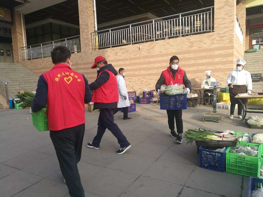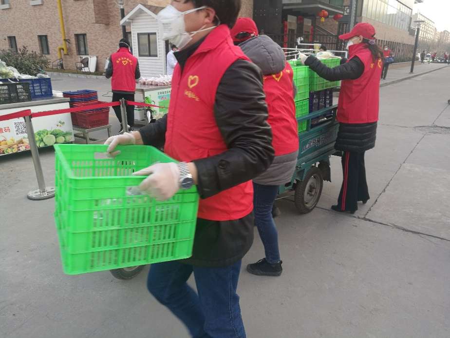 发出倡议后,居民积极响应报名参加。2月20日清晨8点,第一批志愿者在沁园社区集合,社区主任王先锋带队前往后勤蔬菜供应点,志愿者们搬运蔬菜、整理分类,做好居民购菜前的准备工作。