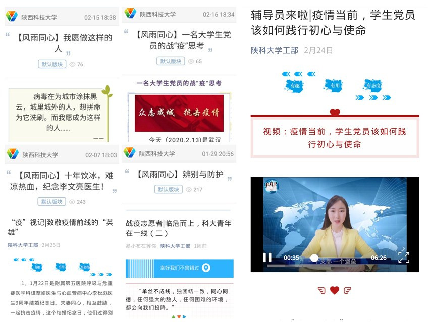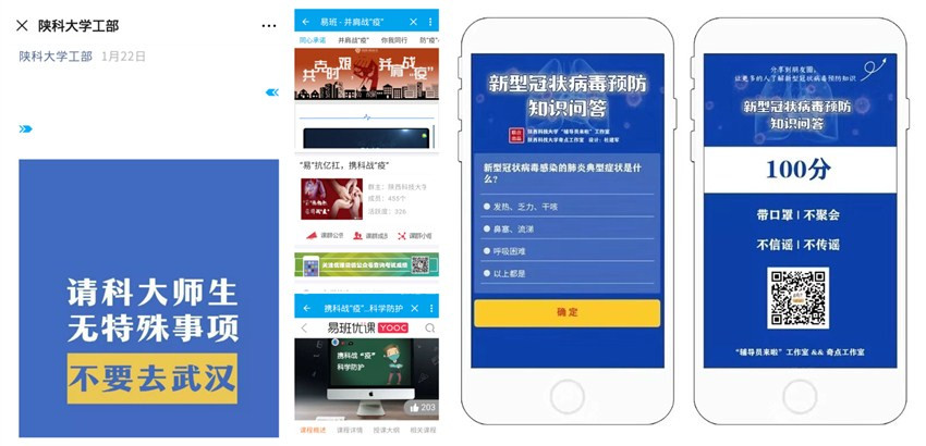 1月22日,学工部通过易班、陕科大学工部官方微信公众号推送《关于新型肺炎,科大师生支持请转》,第一时间号召全体师生加强防范,该条推文获得7000+浏览。随后,上线“共克时艰,并肩战疫”轻应用、“易抗亿扛,携科战疫”、“携科战疫,科学防护”等优课课群,每日更新疫情相关动态、防护知识和学校疫情防控各项工作通知,引导学生积极应对疫情,坚定必胜信念;开展“新型冠状病毒肺炎防控知识问答”活动,累计超过35万人参与知识问答,产生了良好的社会效应。
