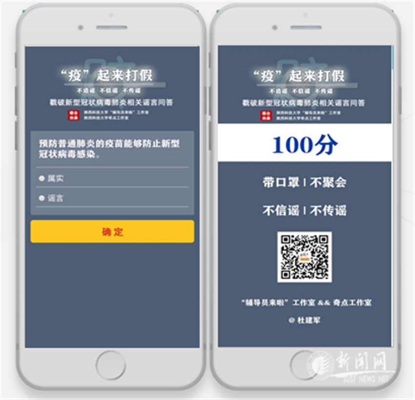 学工部基于易班平台开展“疫起来打假”——戳破疫情相关谣言问答活动,截至目前已有8000余名师生参与答题;“辅导员来啦”、“律述法芽”辅导员网络文化工作室以视频、图文等形式制作《我与老妈智斗谣言的日子视频》《“火”?传谣总是无理,造谣“法式”有“礼”》等作品,并通过优课课群话题讨论等多种形式广泛开展辟谣活动,在疫情期间始终坚持为师生维护清朗的网络空间,引导广大学生学会辨识形形色色的网络信息。