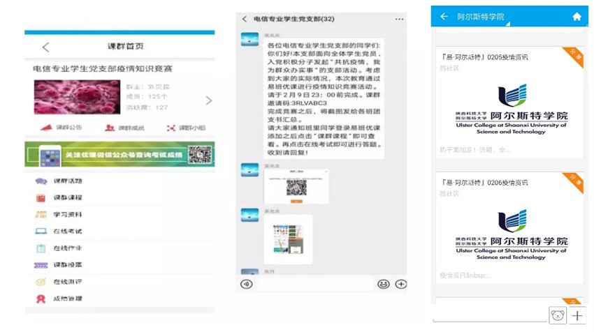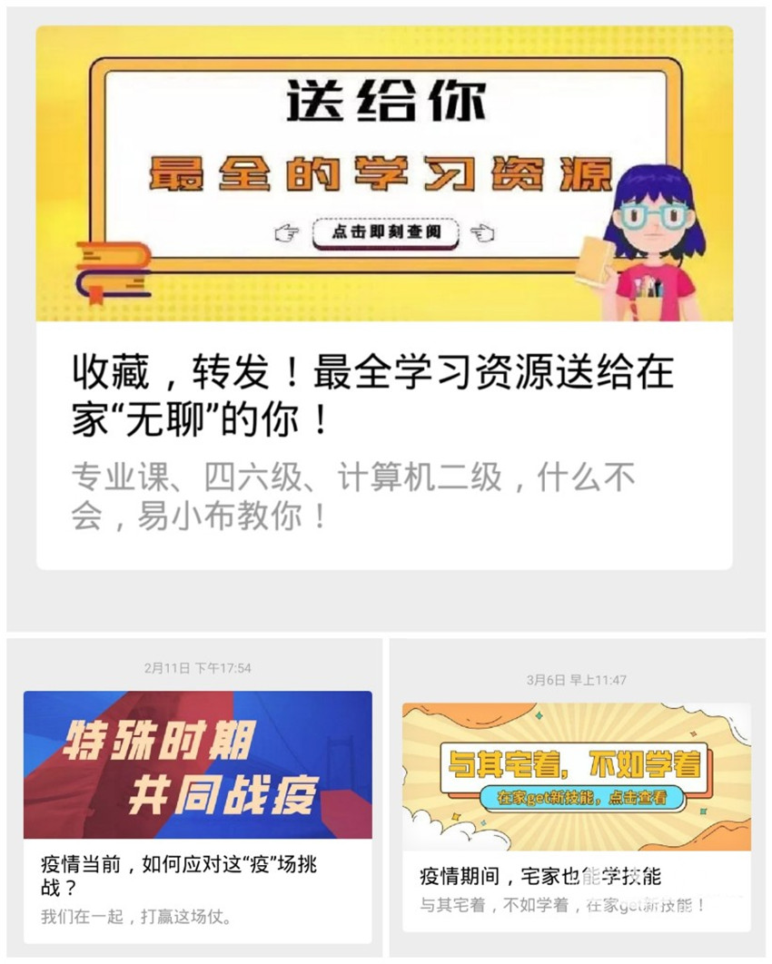 为消除假期延长可能给学生带来的懈怠、懒散等负面影响,学工部充分利用易班平台社区互动优势,持续更新优课课群,丰富线上学习资源,及时补给学习提升的养分。易班发展中心充分利用新媒体矩阵,通过易班、QQ、微信、抖音平台发布《收藏,转发!最全学习资源送给在家“无聊”的你》《疫情之下,如何面对这一场挑战》、《上网课的你和老师》等图文、视频作品,深化思想引领,引导学生加强自我管理,科学合理规划假期生活,停课不停学。