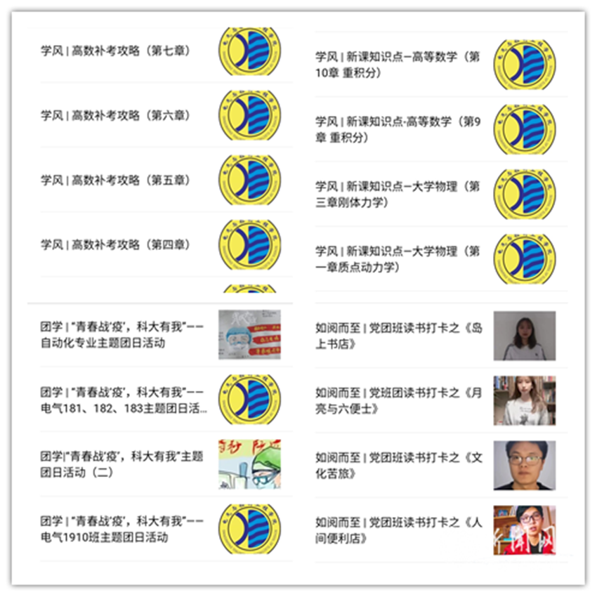 电气与控制工程学院易班工作站利用易班社区互动平台开展“如阅而至”党团班读书打卡活动、“补考攻略”复习打卡活动、“新课知识点”学习打卡活动、“青春战‘疫’,科大有我”主题团日活动风采展等,引导学生充分利用假期进行学习,补充精神之“钙”。
