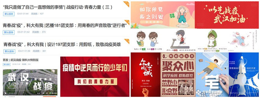 设计与艺术学院易班工作站结合学院特色,开通“以艺战疫”专栏,把从各学生党支部、团支部征集的40余幅作品进行展播,凝聚爱国共识。手绘条漫《特殊时期给我带来的……》、剪纸《致敬战疫英雄》等作品,用设计定格感动;艺播专业创作的《用青春的声音致敬逆行英雄》,用音频传递信念;学生会创作的MV《平凡天使》,用歌声鼓舞人心;编导专业创作的《武汉战疫》SUST特别版、《我们是湖北Susters,向母校报到。科大见!》,用影像凝聚温暖;学生事迹系列报道《战疫行动,青春力量》和文章《一名设艺青年眼中的“逆行者”父亲》,用文字记录担当。