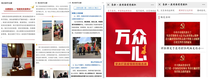 材料科学与工程学院易班工作站对学院参与一线疫情防护工作的7位同学进行了线上采访报道,树立青年榜样,进行舆论宣传;经济与管理学院易班工作站为发挥学生党员在抗击疫情中的模范带头作用,搭建线上轻应用“疫情面前党旗红”,引导党员提高政治站位,强化党员意识,主动发挥党员作用,坚定打赢疫情攻坚战的信心和决心。