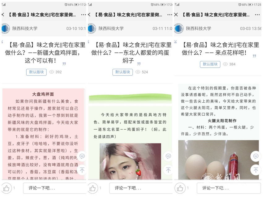 食品与生物工程学院易班工作站依托易班社区互动平台开设“味之食光”专栏,号召广大学子们亲自动手学做美食,用视频、图文等形式进行呈现,将提升个人生活技能与人文素养相结合、提升钻研能力与专业认知相结合,在劳动中感受生活、感悟成长。截至目前,已经发布推文20篇,累计阅读量6800余次,深受同学们喜爱。食品教改18的朱姬颖在学习并尝试制作“姥姥真传牌油条”后表示,“习近平总书记在全国教育大会上强调,‘要在学生中弘扬劳动精神,教育引导学生崇尚劳动、尊重劳动,懂得劳动最光荣、劳动最崇高、劳动最伟大、劳动最美丽的道理。’劳动不仅让我收获了与家人在一起的快乐,更让我深刻的认识到劳动是我们生活不可或缺的一部分,以后我们也要积极参加劳动,成为新时代合格建设者和可靠接班人。”