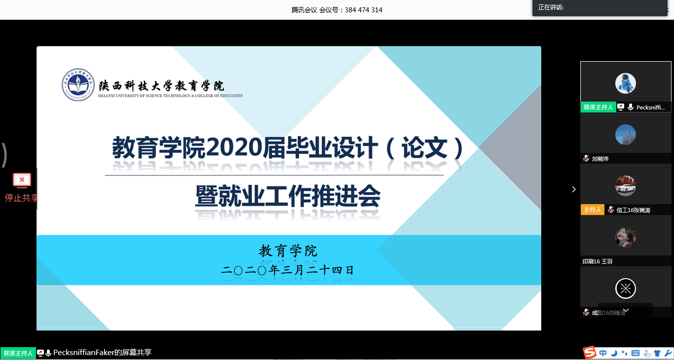 3月24日下午17时,教育学院通过腾讯视频会议,召开了2020届毕业生毕业设计(论文)工作暨就业线上推进会。副院长郭国法主持了本次线上工作会,学院党政领导、各专业毕业设计(论文)负责人、职能部门相关老师及全体2020届毕业生参加了本次推进会。