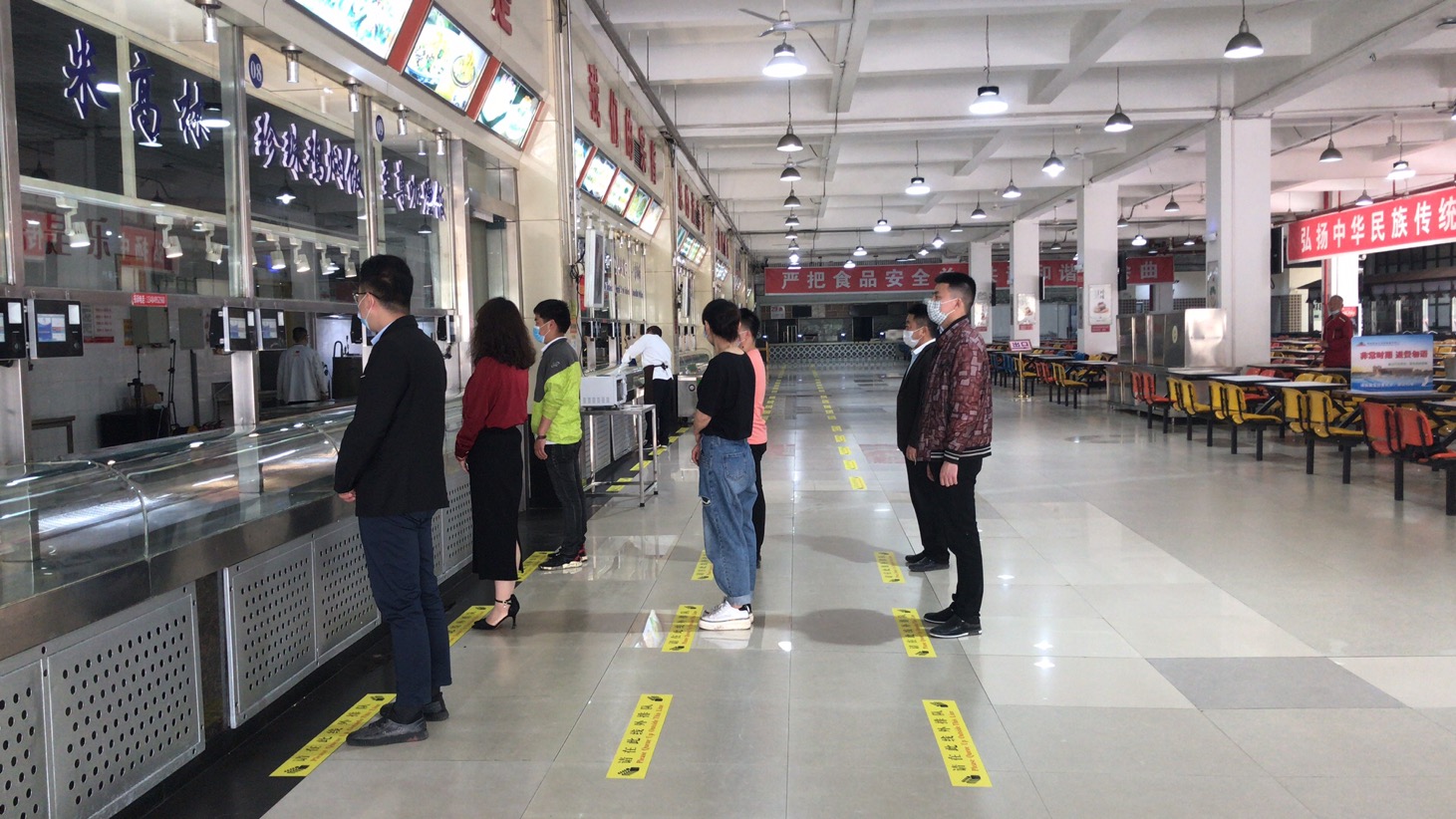 通过食堂温馨提示、LED大屏幕等对就餐人员进行引导,间隔1米的排队指示黄线,打饭时保持安全距离。