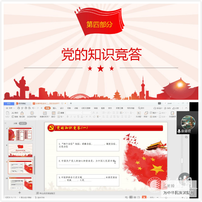 通过分享红色电影、红色书籍、党史知识竞赛等,支部党员重温红色经典,从历史中汲取理想信念给养,传承红色基因,筑牢信仰之基。本科第二党支部通过《永不消逝的电波》、《湄公河行动》、《我和我的祖国》、《红海行动》等观影分享,引发支部成员热烈讨论;本科第一党支部通过“三个一”分享会,即“分享一部红色电影、介绍一本红色书籍、讲一个红色故事”,引领支部党员激发爱党爱国热情;研究生第一党支部则通过党史知识竞赛,通过留言的方式在腾讯会议进行评论抢答,以赛促学,切实提高党员党性修养。