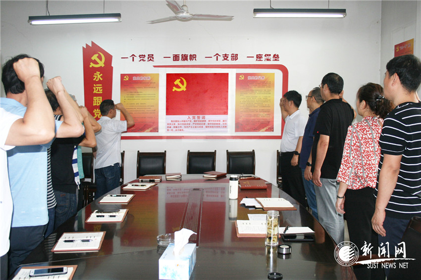 在重温入党誓词环节,支部书记龚世平带领全体党员面向党旗高举右拳,高声宣读入党誓词,再次接受心灵的洗礼,重温为共产主义事业奋斗终身、随时为党和人民牺牲一切的的庄严承诺。