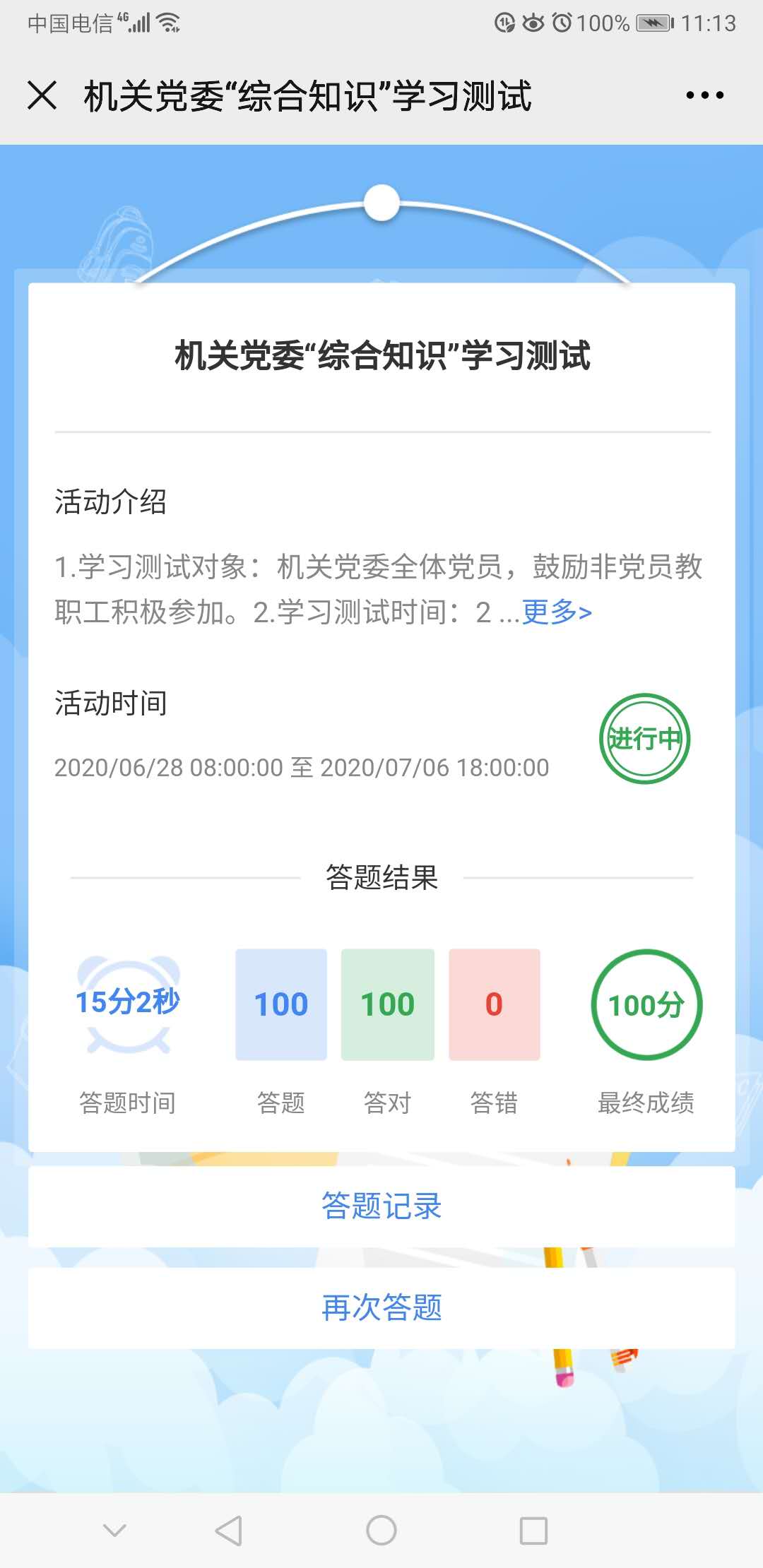 本次学习测试效果显著,从有些同志答题次数及成绩显示,知识掌握明显逐步提高。机关党委20个党支部全部参与了这次学习测试,党员参与率达95.21%,还有一些非党员干部也参加了学习测试。90分以上的达114人。依据学习测试规则评定,校友总会党支部、纪监党支部、规划处党支部、工会党支部、实验管理处党支部等五个支部获得优秀组织奖。