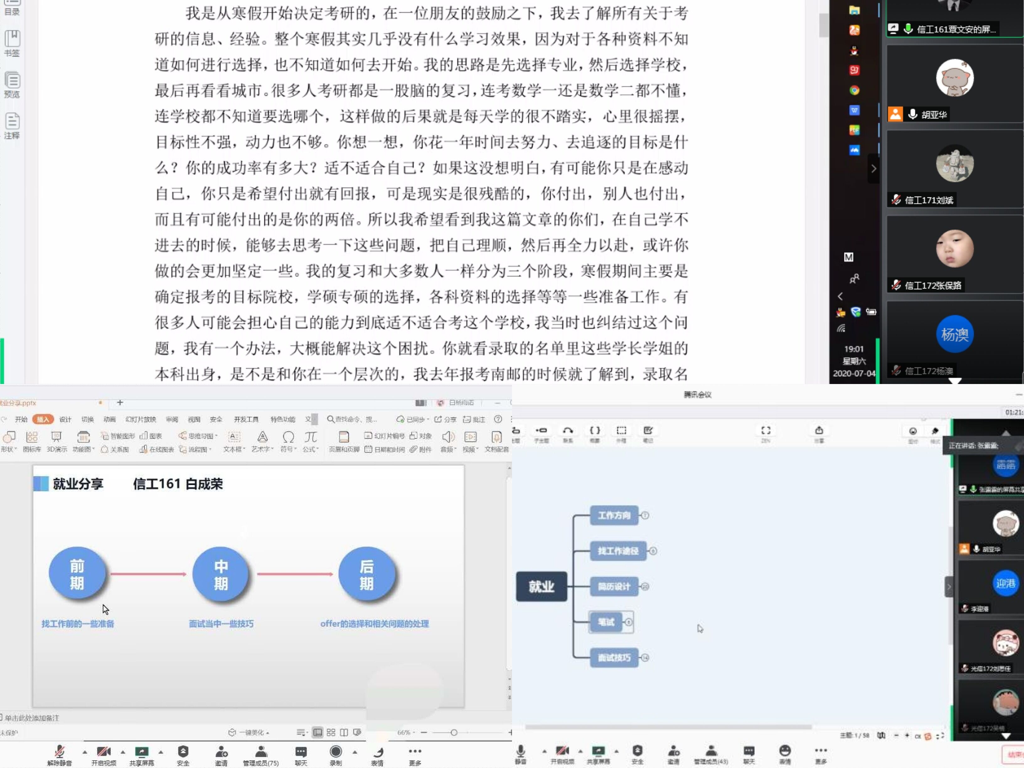 组织考研就业经验交流,薪火相传。7月3日至4日,各党支部联合2017年级组在线上开展了“传帮带—考研就业经验交流会”主题党日活动。活动邀请了来自毕业年级的党员代表、保研至金沙官网的尚佳童同学,经历考研失利后成功签约京东方的党员代表李文博同学等一批在在考研和就业方面比较突出的毕业生分享了相关经验。17级学生纷纷表示,此次特殊的党日活动,给了自己很大的启发,让他们对未来有了更清晰的规划。