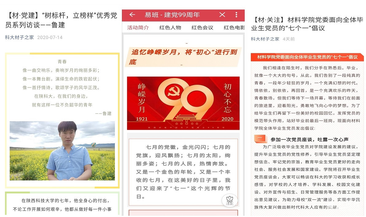 云端献礼,营造氛围谱新篇。材料学院坚持“疫情防控常态化”下的支部生活“云端化”,依托“科大才子之家”微信公众号、易班等新媒体平台相继推出了“树标杆,立榜样”优秀党员系列推文、“建党99周年”易班快搭、红色故事视频以及针对毕业生党员发起的“七个一”倡议等一系特色活动,在全院营造广大党员争做先锋,勇于担当作为的浓厚氛围。