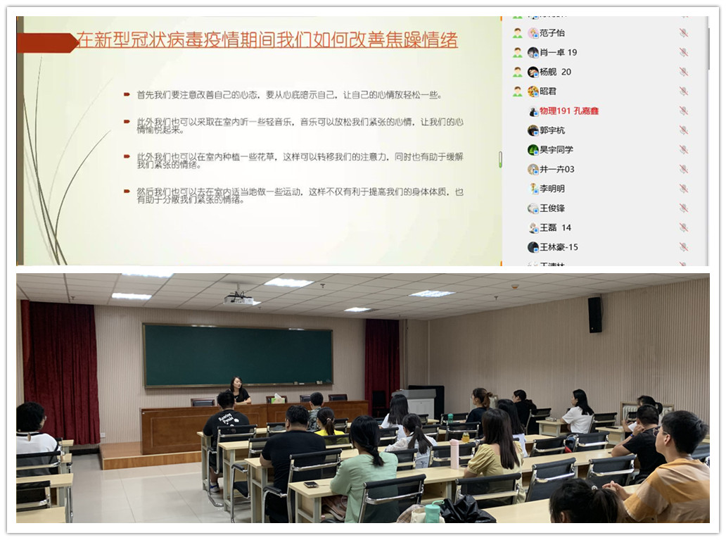 心理团辅解忧愁。暑假期间,学院精心策划,组织实施“疫心疫意,授渔计划”,前期通过对班级心理委员进行线上心理辅导,讲授焦虑情绪缓解方法,让班级心理委员充分发挥作用,帮助班级同学舒缓情绪;同时,对学院“桃理园成长营”帮扶团队团辅技能进行培训,提升心理帮扶团队专业技能,做好同学们的“心理能量包”。学生返校后,为了缓解学生随之而来的考试压力,“桃理园成长营”秉承“学以致用,助人自助”的职责,面向全院学生分别举办学习主题团辅和压力主题团辅,引导学生树立正确的学习目标,有效释放压力、缓解情绪。对重点学生,辅导员开展一对一面对面谈心谈话,了解学生复学状态。