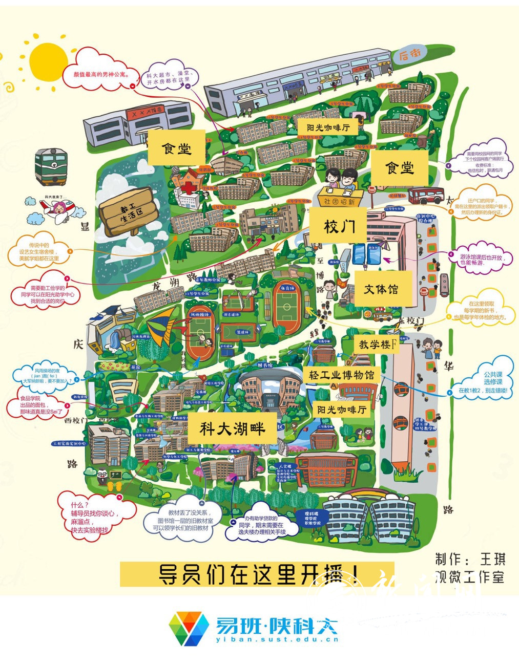 上午十点,直播活动正式开始,来自各学院的辅导员们先后带领新生云游了网红餐厅、新生宿舍、阳光咖啡馆、文体馆、操场、教学楼、校史馆、轻工博物馆、科大湖等地打卡,每个场景都有相应的主播负责介绍,主播们风趣幽默,一路走一路播,并与直播中新生们提出的问题互动,在展示校园风貌的同时也为新生答疑解惑。