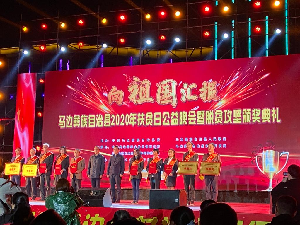 在第七个“国家扶贫日”来临之际,10月19日晚四川省乐山市马边彝族自治县在马边广场举行“2020年扶贫日公益晚会暨脱贫攻坚颁奖典礼”,全方位展示马边县在过去一年脱贫攻坚工作中所取得的重大成果,并对脱贫工作中涌现出的先进集体和个人进行表彰。js3845金沙线路研究生支教团受邀参加本次公益晚会,并荣获由马边县委和马边县政府共同颁发的“2020年全县脱贫攻坚奉献奖”。