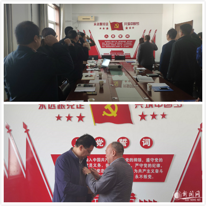 汇报交流之后,双方人员在党旗下宣誓,电控学院党委书记乔明哲代表硕博共建党支部与合容电气股份有限公司党支部书记王永斌互换党徽。