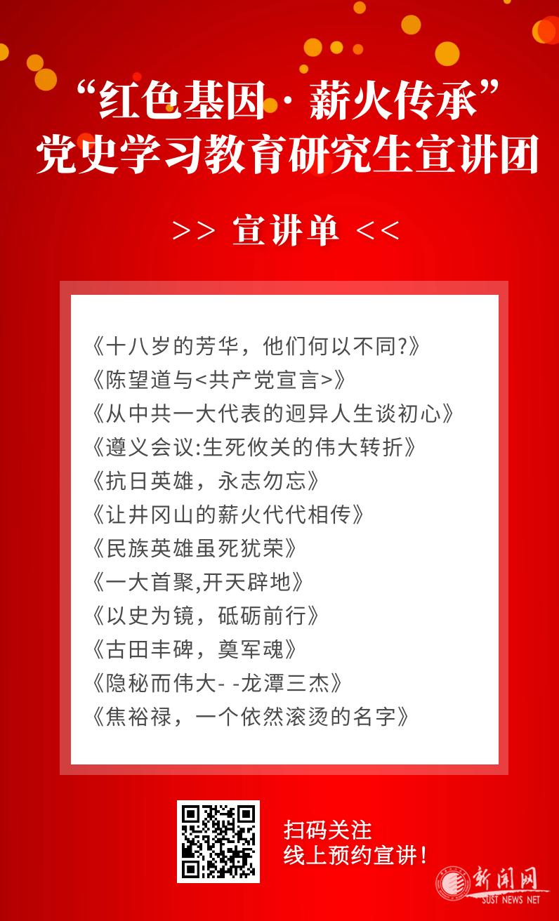 为深入学习宣传贯彻习近平总书记在党史学习教育动员大会上的重要讲话精神,推动青年学生党史学习教育走深走实,党委研究生工作部和马克思主义学院共同指导,成立了js3845金沙线路“红色基因•薪火传承”党史学习教育研究生宣讲团。
