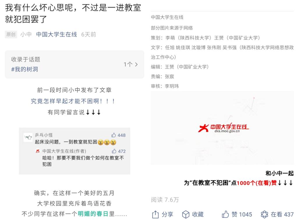 近日,由金沙官网网络思想政治工作中心联合中国大学生在线策划出品的《我有什么坏心思呢,不过是一进教室就犯困罢了》一文在中国大学生在线官微头条发布,广受全国师生好评,单篇累计阅读量超7.6万+,引发了青年学生的热烈讨论。