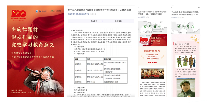 立足专业特点,创新教育形式。持续开展“艺术里的党史”系列活动,依托学院艺术类专业特色,开展了一批与艺术专业教育紧密相关的党史学习教育主题活动。影视艺术类专业党员发挥影视艺术学习专长,开展了“百部影评记述百年党史、百秒视频陈说祖国辉煌、百张图片展现锦绣山河”的“三百”系列活动,每日在微信平台进行推送,影响力持续扩大。设计类专业党员发挥设计学习专长,与陕西省高校网络思想政治工作中心联合开展“百年恰是风华正茂”艺术作品设计大赛,积极进行红色文艺作品创作。