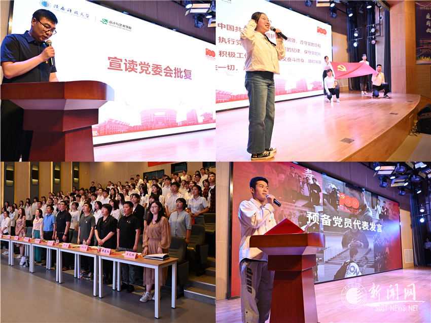 预备党员宣誓仪式上,与会人员奏唱《国际歌》。李红坦宣读了学院党委会关于批准预备党员的批复。学院党委委员及各党支部书记上台为预备党员佩戴党员徽章。全体党员面向党旗,在领誓人肖曌霞的带领下,右手握拳、郑重宣誓。编导专业本科生党支部刘睿甄代表全体预备党员发言,讲述了自己学习党史的感悟,并表示很荣幸在中国共产党成立一百周年之际加入党组织。