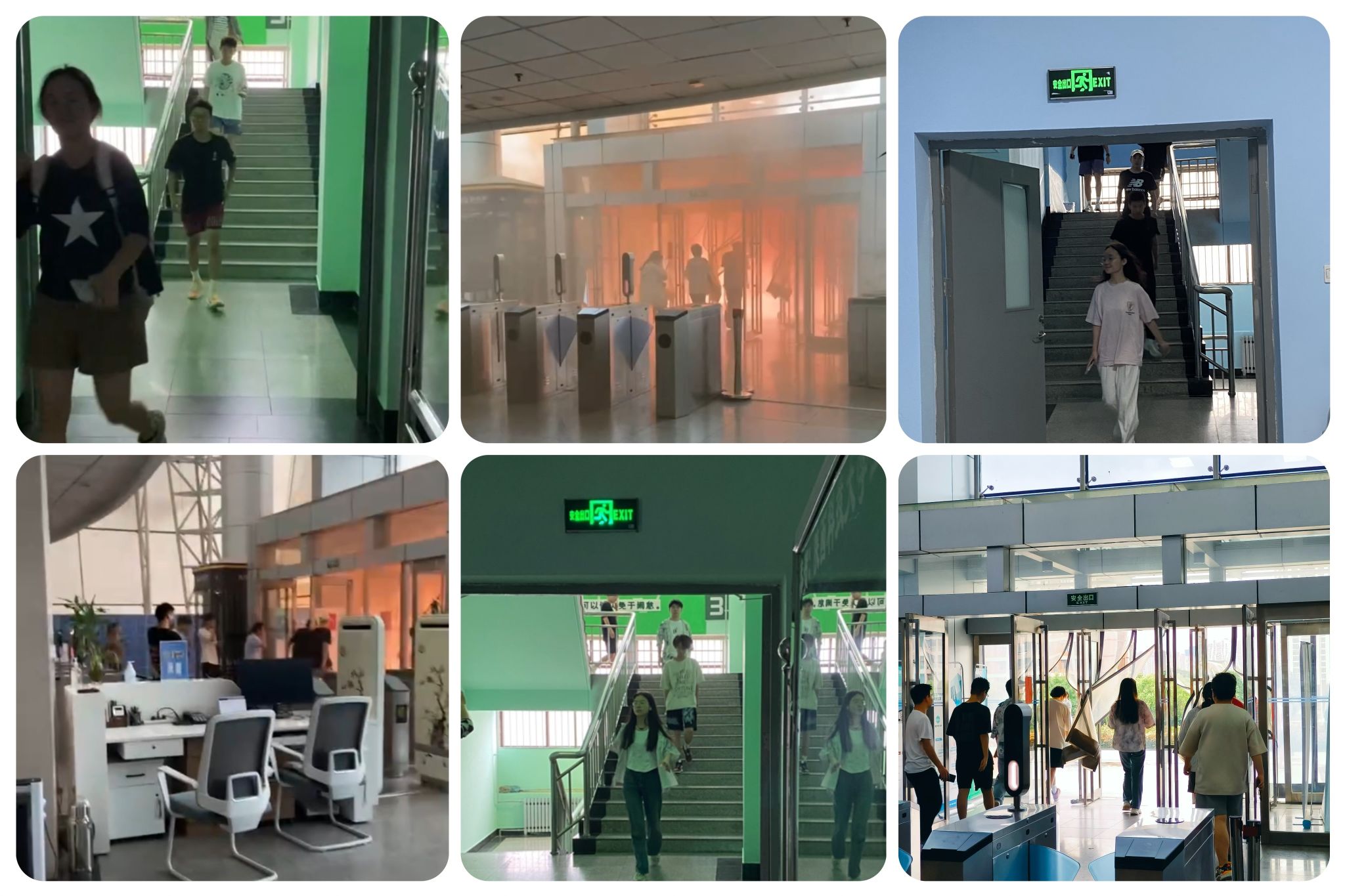 演练当天,工作人员按照演练方案,提前到达负责疏散位置,并通过广播系统播放演练疏散注意事项。9点30分演练正式开始,保卫处设置模拟火源,火警报警系统立即启动,馆内师生在工作人员的指引下,从消防安全通道迅速、有序地撤离到馆外安全区域。