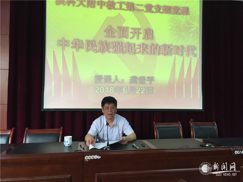 6月22日上午,龚世平在西二楼报告厅为教工第二党支部全体党员上了一堂题为“全面开启中华民族强起来的新时代”的党课。龚世平强调,不忘初心,方得始终,全体教师党员要恪守政治纪律、政治规矩,做讲政治的表率;全面培育学生核心素养,做教书育人的先锋;严守师德底线,做廉洁从教的模范;要以高尚的品德、良好的心态、扎实的作风认真做好本职工作。