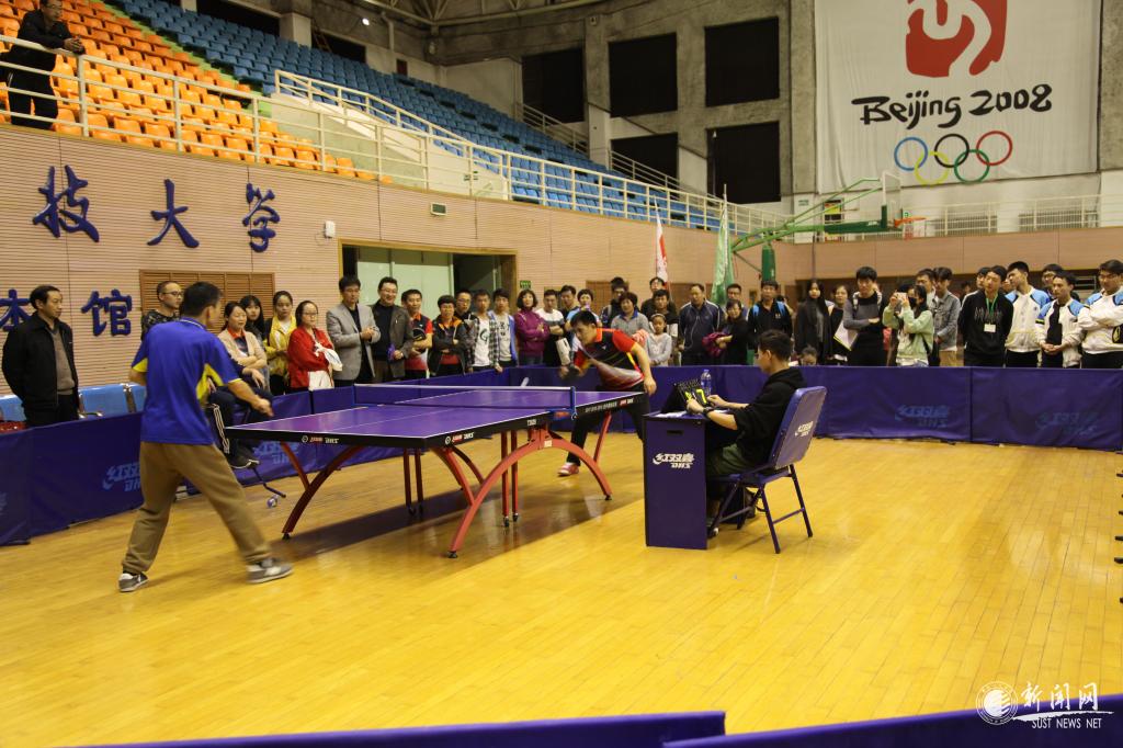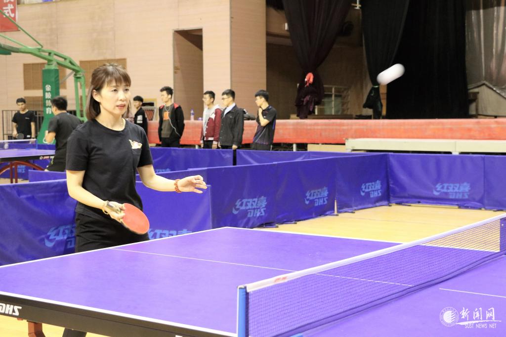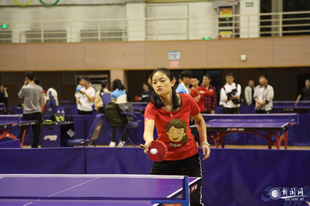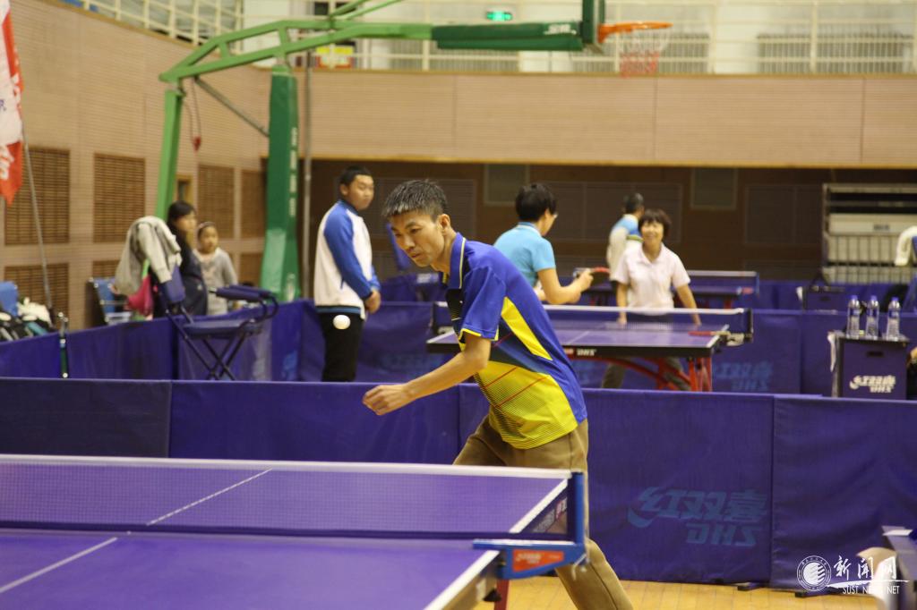 教工男子团队比赛最吸人眼球,远远地就能听见观众们的喝彩声,文理学院吴云天老师每年都参赛,属于中年组“健将级”选手,只见他拿出专业水平,每打一球,就会在台上搓一下手,拍一下球台,防止手汗影响发挥。