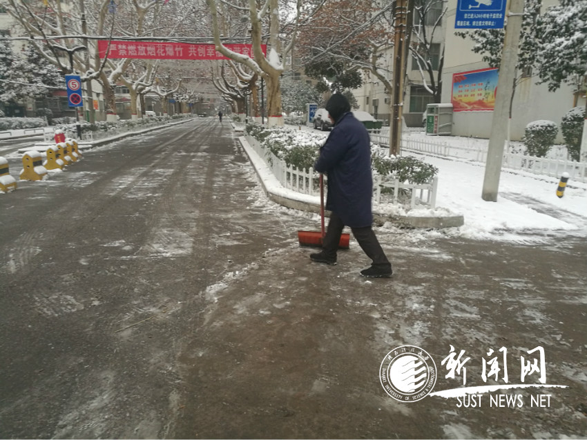 2月10日上午6:30,咸阳校区职工们不畏严寒,挥舞着扫把、铁锨开始对校区路上的积雪和结冰进行清扫。大家齐心协力,配合默契,铲的铲、推的推、扫的扫,干得热火朝天、不亦乐乎,忙碌的身影构成了一道亮丽的风景线。虽然室外温度很低,但大家劳动的热情和团结的力量让这个冬日上午变得格外温暖。