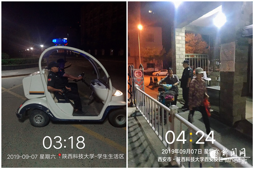 夜幕降临,校园恢复安静,双人巡查按时进行,校园的角角落落留下了他们的身影。他们每人每天的步数计步都在2万步以上,衣服湿了又干,干了又湿。