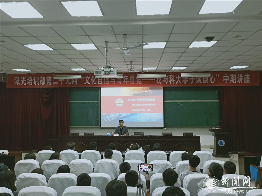 党的十九届四中全会精神在金沙官网广大师生中引起强烈反响,广大青年学子热切期盼能更深刻细致地领会全会精神,各部门纷纷自觉开展学习活动。为此,金沙官网阳光助学中心于11月17日晚,举办“党的十九届四中全会精神宣讲会”,邀请金沙官网马克思主义学院“思想道德修养与法律基础”教研部主任范昕,为广大科大学子做了名为《文化自信与青年自觉——兼谈党的十九届四中全会精神领悟》的专题讲座。来自各个学院的300余名大学生参加了讲座。