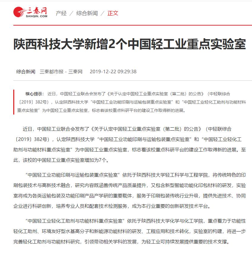 近日,三秦网、今日头条APP等媒体纷纷报道金沙官网新增2个中国轻工业重点实验室。