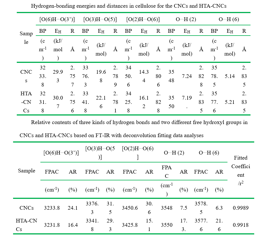 目前的研究表明,R-CNC在特定条件下可以转换成环状拓扑结构HTA-CNC。球差校正透射电子显微镜结果表明,HTA-CNC的尺寸特征:环直径10.0-30.0 nm,环壁宽度3.0-4.0 nm,环厚度2.0-5.0 nm。FT-IR光谱及拟合结果表明,HTA-CNC的三种氢键数量减少,游离OH增加。拓扑形貌HTA-CNCs的结构和氢键变化趋势,分子动力学模拟与FT-IR拟合结果趋势一致,结晶区结构松弛,氢键总量减少了约30%;拓扑形貌形成过程中纤维素分子链苷键键角Tau(C4-O4-C1)及苷键夹角Phi(O5-C1-O4-C4)和Psi(C1-O4-C4-C5)发生了变化。从整体势能上看,HTA-CNC的能量高于R-CNCs,环化需要外力做功,将动能转化为势能,环化过程中形貌结构改变所带来的熵增可能是稳定环状结构的因素。