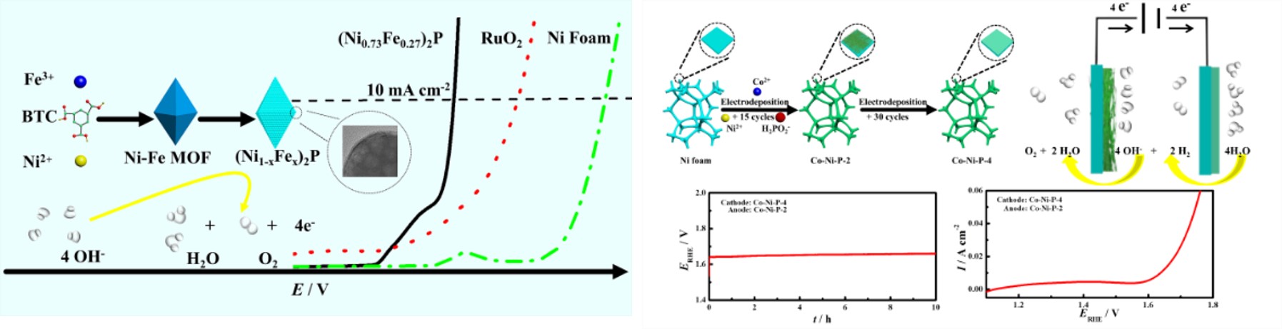 水热合成(Ni1-xFex)2P(左)及电沉积制备的Co-Ni-P(右)用于碱性电催化析氧性能示意图