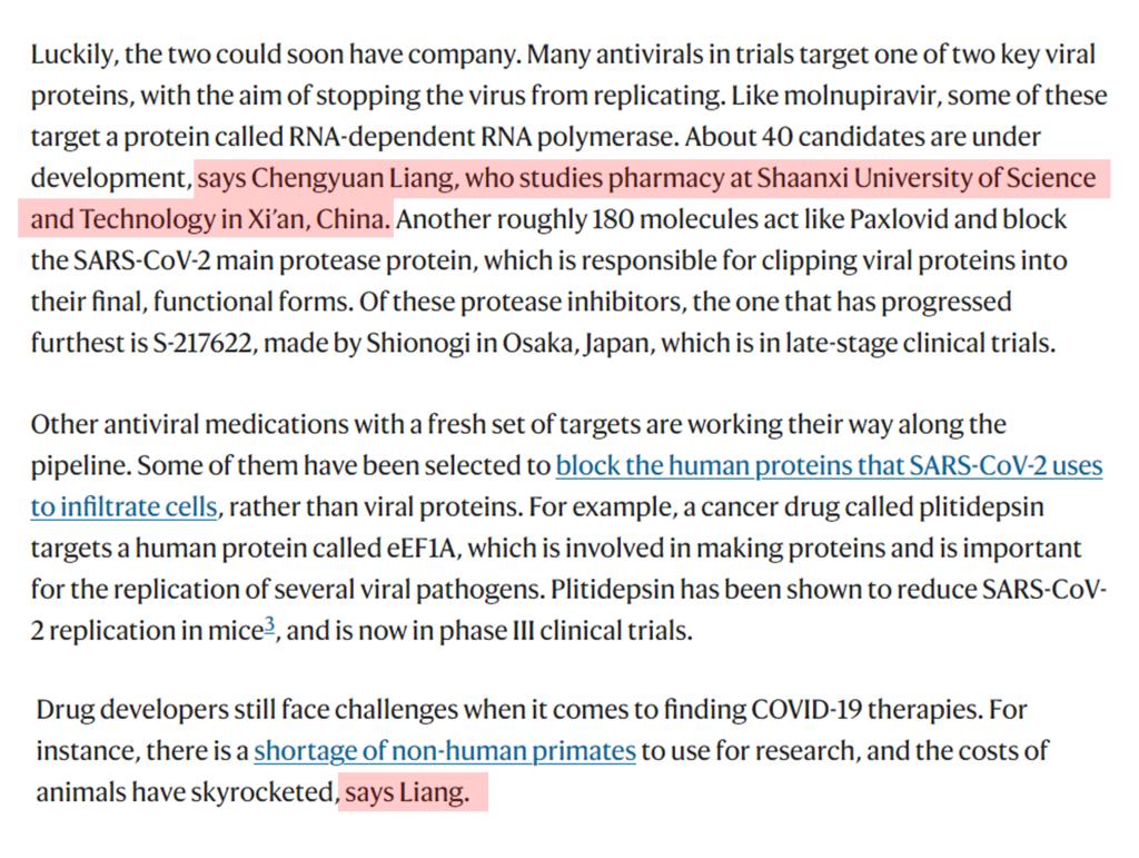 该报道采访了包括美国国立健康研究院(NIH)Lawrence Tabak 、牛津大学Peter Horby等在内的5个知名新冠肺炎药物研究团队。金沙官网陕西省生物医药重点产业链成果转化创新团队核心成员、食品与生物工程学院药学系梁承远副教授作为亚太地区唯一受访者接受了《Nature》杂志25分钟的电话采访,回答了关于中药在新冠肺炎治疗中的应用,RNA依赖性RNA聚合酶(RdRp)和3CL蛋白酶(3CLpro)抑制剂各自优劣比较,新冠病毒治疗药物开发面临的制约因素,新冠药物开发的新靶标等问题。