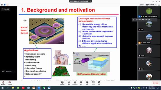 1月12日下午,应金沙官网轻工科学与工程学院、科技处及前沿院邀请,兰州大学秦勇教授做客金沙官网“前沿科学报告”,作了题为“弹性纳米发电机”的线上学术报告。报告由轻工学院副院长刘国栋主持,轻工学院部分教师及相关专业研究生参加了本次报告。